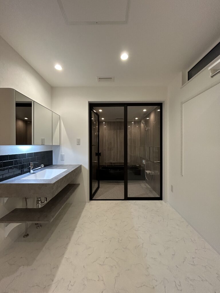 名古屋モザイクのタイルとアイカの洗面化粧台。造作洗面は選べるバリエーションが豊富。同じにならないところがいいところ。